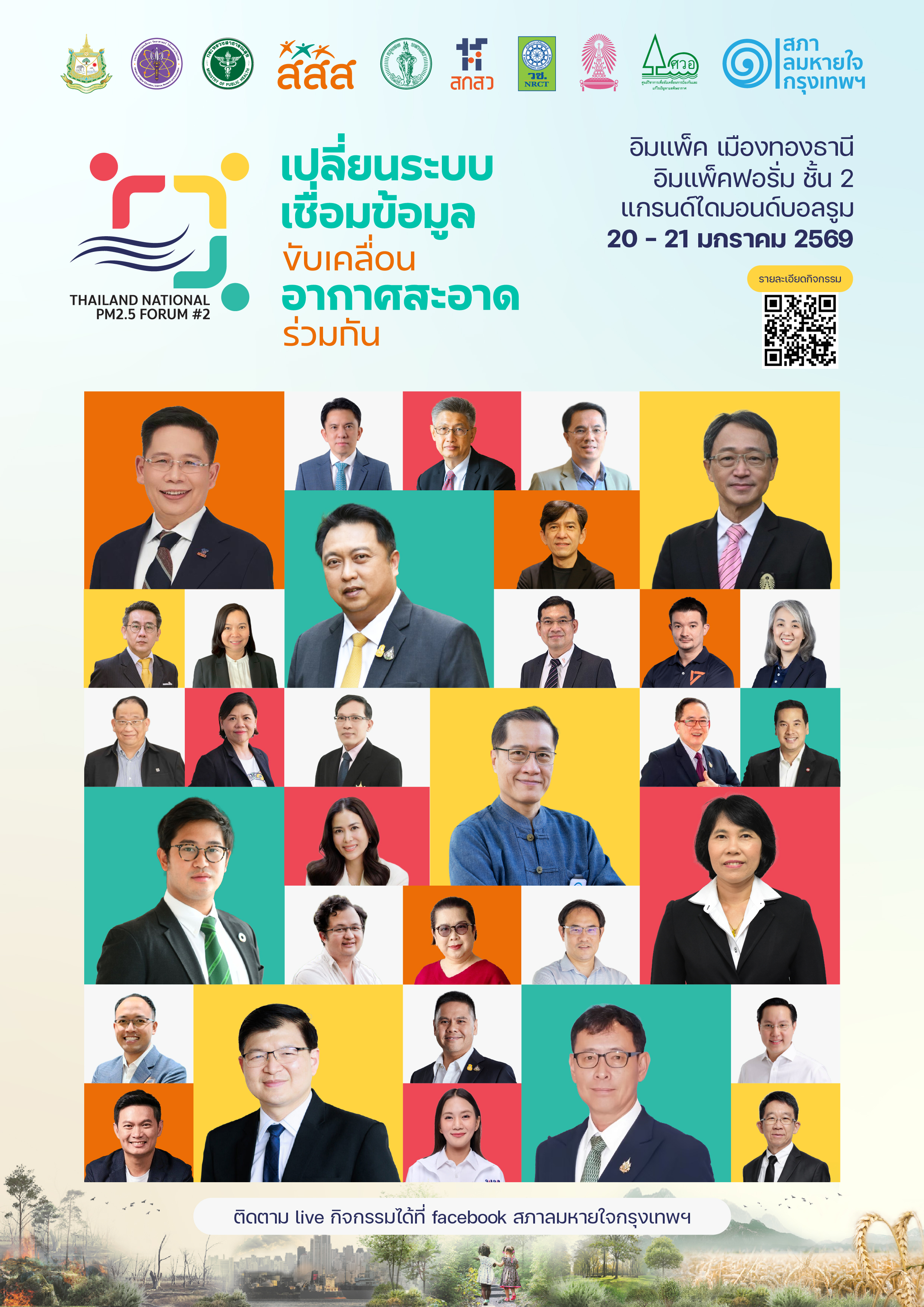 งานนี้คือการรวมตัวของภาครัฐ นักวิชาการ ภาคเอกชน และภาคประชาสังคม รวมถึงคนทำงานในพื้นที่จากหลากหลายบริบท เพื่อมุ่งมาร่วมแลกเปลี่ยนความรู้ ข้อมูลและประสบการณ์จริงในการแก้ปัญหาฝุ่น PM2.5 อย่างเป็นระบบ Thailand National PM2.5 Forum อิมแพ็ค เมืองทองธานี 20–21 มกราคม 2569