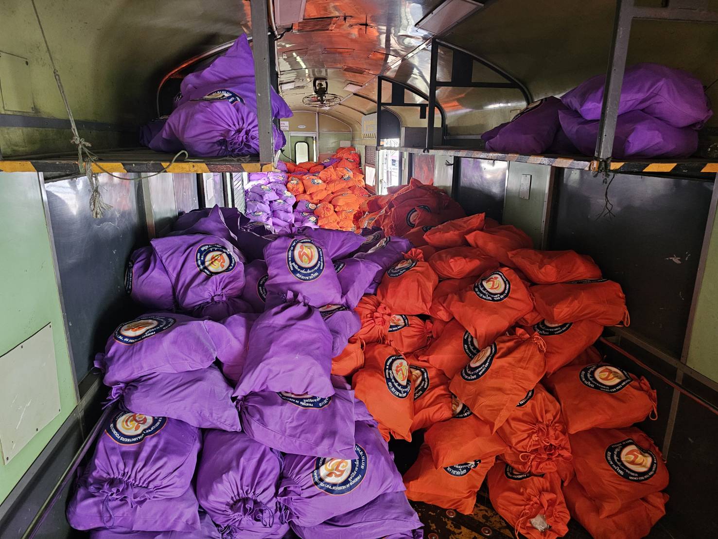 รถทหารจะจอดเทียบใกล้ชานชาลา กำลังพลขนถุงพระราชทานส้มม่วง 7,600 ถุง จะยกทีละถุงส่งต่อกันไปแบบมือต่อมือจนถึงตู้สินค้าของขบวนรถไฟ แล้วอีกทีมจะส่งขึ้น เพื่อทีมที่อยู่บนโบกี้รับต่อไปเป็นทอดจนกองครบเป็นกลุ่มๆ ที่พื้นโบกี้