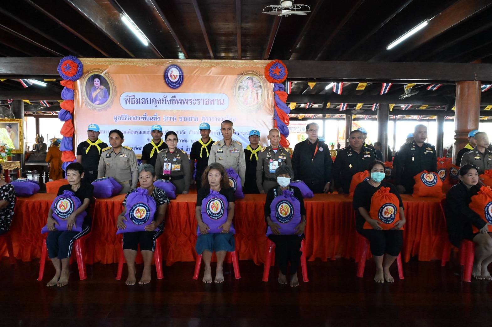 จากนั้นประธานและคณะเชิญถุงยังชีพพระราชทานถวายแด่คณะสงฆ์ จำนวน 130 ถุง และมอบถุงยังชีพพระราชทานให้แก่นายอำเภอบางปลาม้า และ นายอำเภอสองพี่น้อง เป็นตัวแทนในการนำไปมอบผู้ประสบอุทกภัยในพื้นที่ และประชาชนที่มาร่วมในพิธี จำนวน 2,470 ถุง