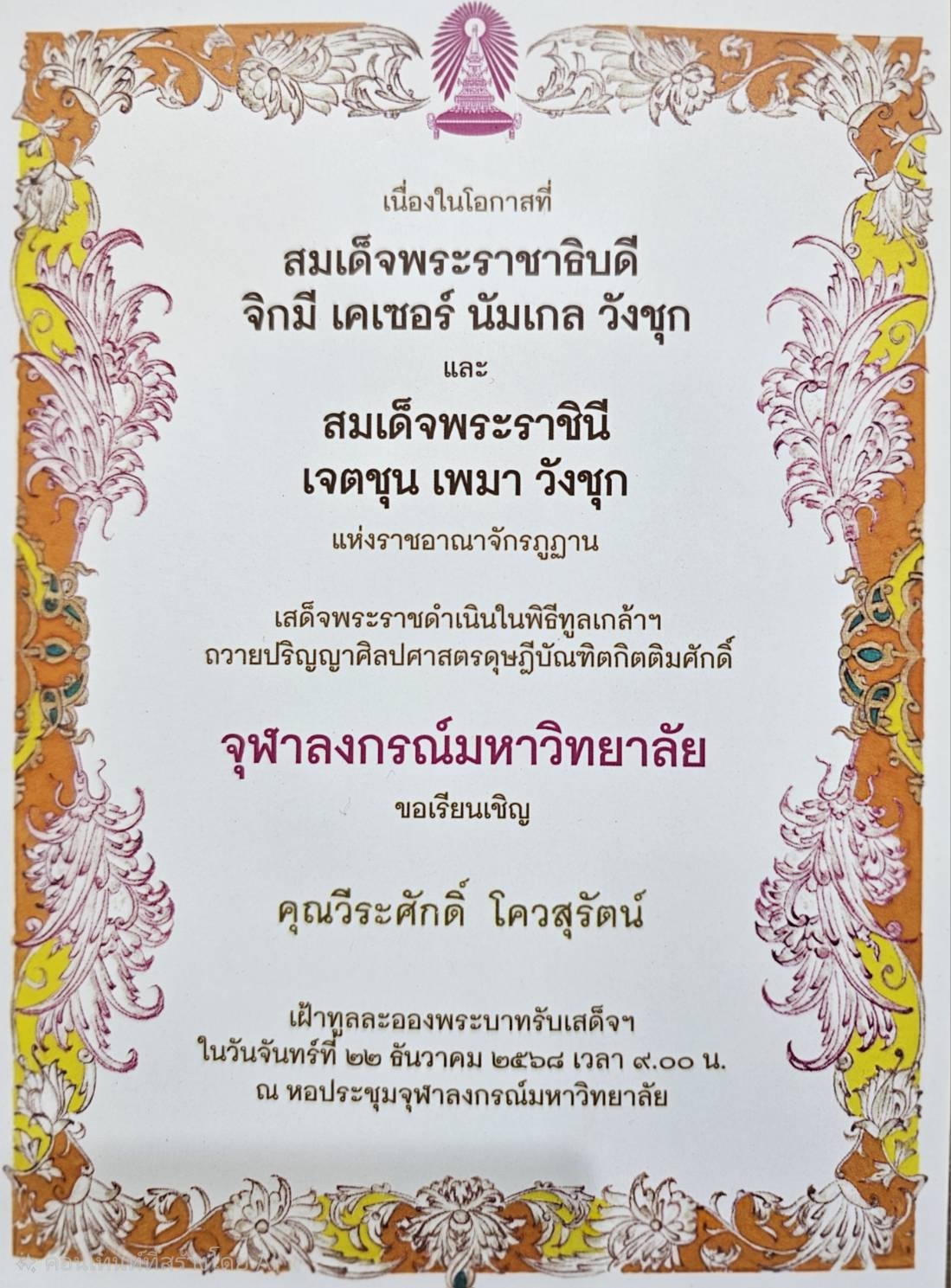 วันจันทร์ที่ ๒๒ ธันวาคม ๒๕๖๘ เวลา ๙.๐๐ น. ณ หอประชุม จุฬาลงกรณ์มหาวิทยาลัย เข้าร่วมเฝ้าทูลละอองพระบาท รับเสด็จฯ สมเด็จพระราชาธิบดี จิกมี เคเซอร์ นัมเกล วังชุก และสมเด็จพระราชินี เจตชุน เพมา วังชุก แห่งราชอาณาจักรภูฏาน เนื่องในโอกาสที่เสด็จพระราชดำเนินในพิธีทูลเกล้าฯ ถวายปริญญาศิลปศาสตรดุษฎีบัณฑิตกิตติมศักดิ์ จุฬาลงกรณ์มหาวิทยาลัย