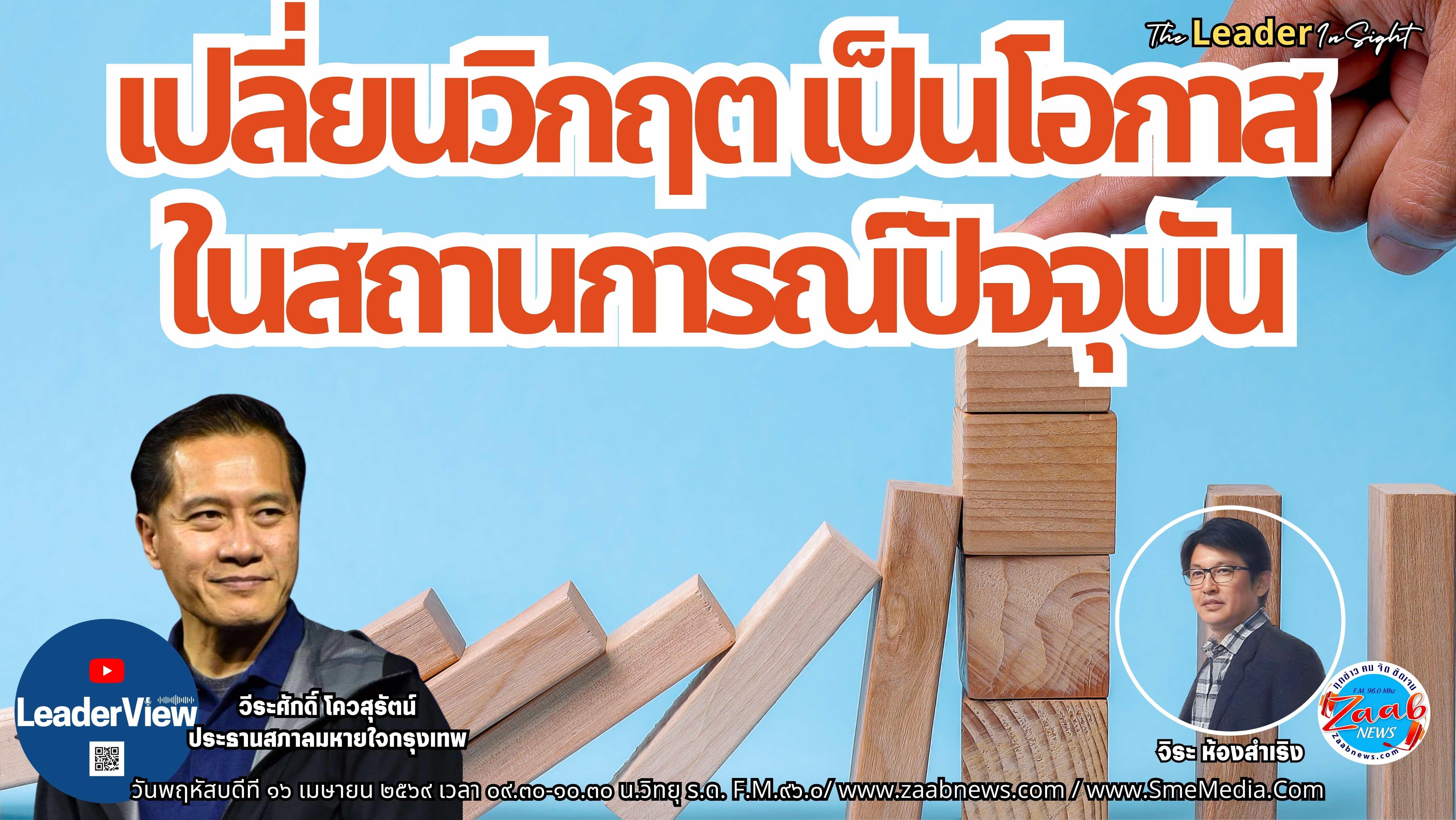 The Leader Insight เปลี่ยนวิกฤต เป็นโอกาส ในสถานการณ์ปัจจุบัน โดย วีระศักดิ์ โควสุรัตน์ ประธานสภาลมหายใจกรุงเทพ และ โดย รศ.ดร.มนตรี โสคติยานุรักษ์ ผู้เชี่ยวชาญด้านเศรษฐกิจ รายการ The Leader Insight วันพฤหัสบดีที่ ๑๖ เมษายน ๒๕๖๙ เวลา ๐๙.๓๐-๑๐.๓๐ น.