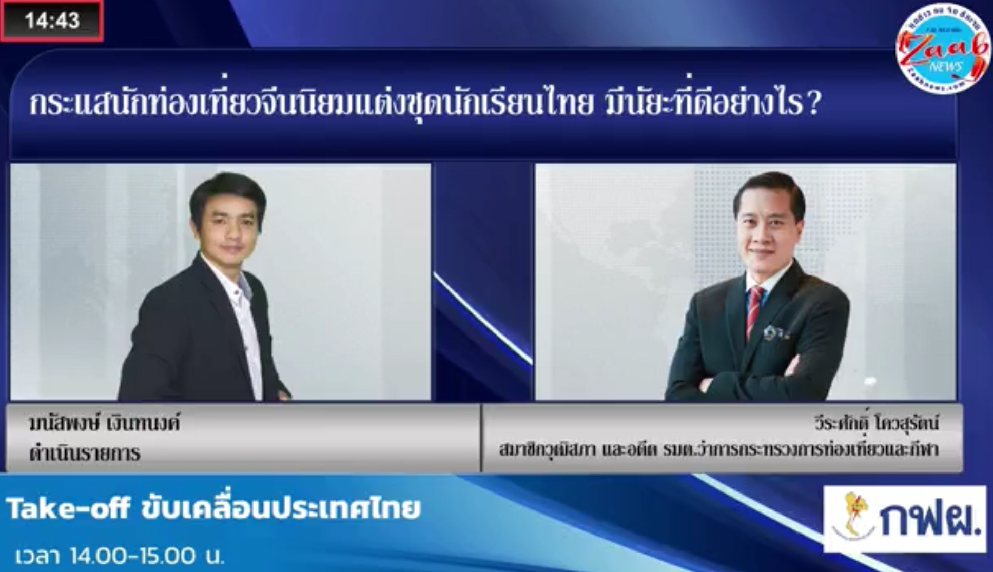 รายการ Take-Off ขับเคลื่อนประเทศไทย สถานีวิทยุ FM 96 MHz. ขอเชิญรับฟัง การสัมภาษณ์และชวนสนทนาประเด็น ‘’กระแสนักท่องเที่ยวจีนนิยมแต่งชุดนักเรียนไทย มีนัยยะที่ดีอย่างไร ?’’ กับ คุณวีระศักดิ์ โควสุรัตน์ สมาชิกวุฒิสภา อดีตรัฐมนตรีว่าการกระทรวงการท่องเที่ยวและกีฬา อดีตผู้ช่วยรัฐมนตรีวัฒนธรรม
