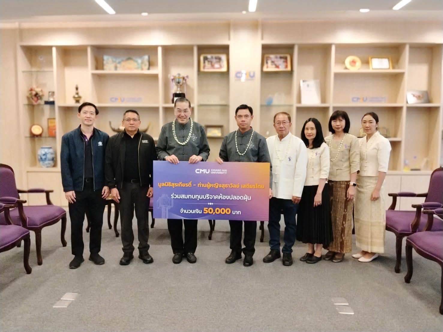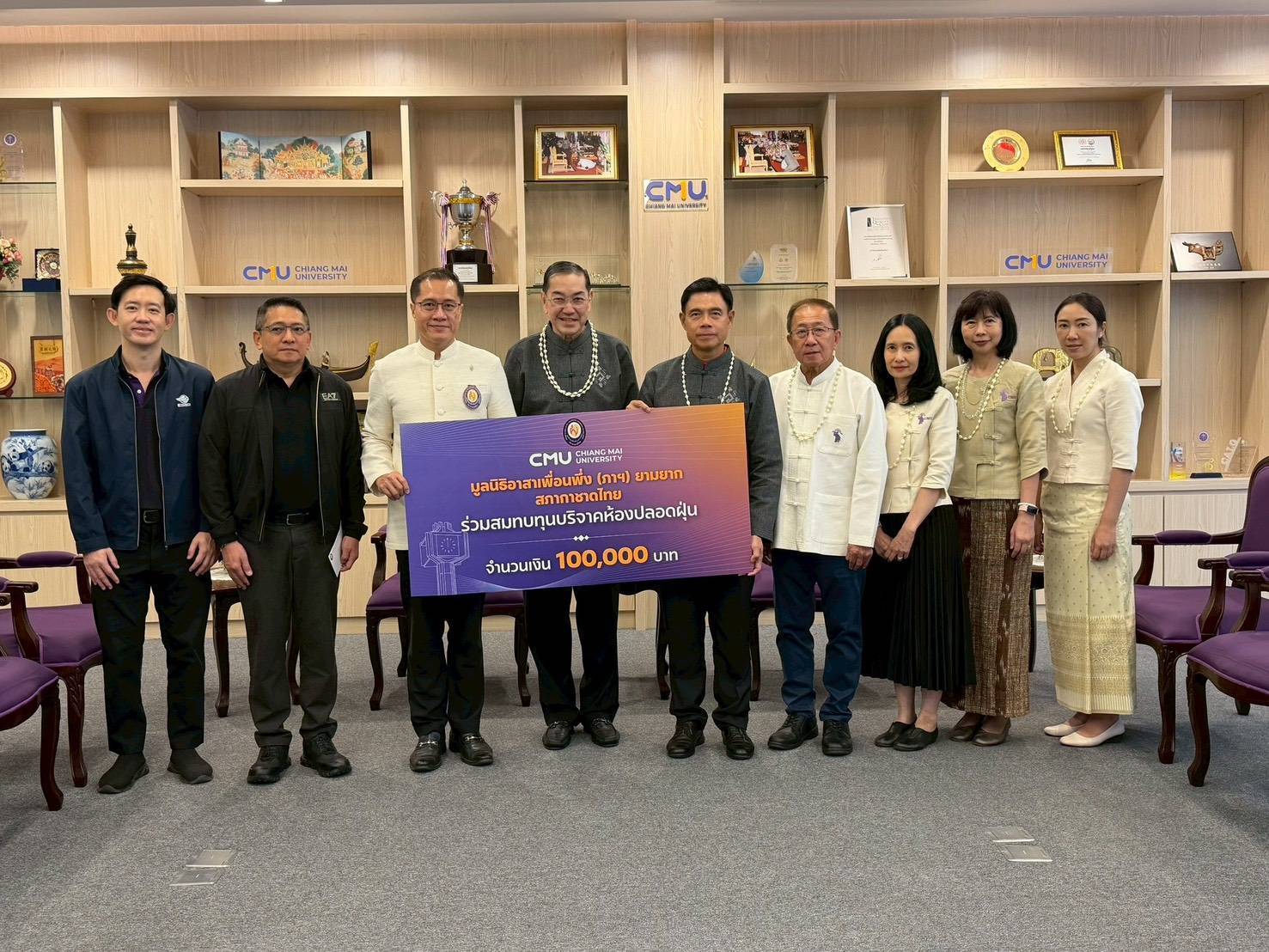 วันเสาร์ที่ 25 เมษายน พ.ศ. 256 ณ ห้องรับรอง มล.ปิ่น มาลากุล อาคารสำนักงานมหาวิทยาลัย 1 มหาวิทยาลัยเชียงใหม่ 9 มูลนิธิอาสาเพื่อนพึ่ง (ภาฯ) ยามยาก สภากาชาดไทย มอบเงินบริจาคจำนวน 100,000 บาท และศาสตราจารย์พิเศษ ดร.สุรเกียรติ์ เสถียรไทย นายกสภามหาวิทยาลัยเชียงใหม่ มอบเงินบริจาคจำนวน 50,000 บาท ในนามมูลนิธิสุรเกียรติ์-ท่านผู้หญิงสุธาวัลย์ เสถียรไทย โดยมีศาสตราจารย์ ดร.นพ.พงษ์รักษ์ ศรีบัณฑิตมงคล อธิการบดีมหาวิทยาลัยเชียงใหม่ เป็นผู้รับมอบ เพื่อสมทบทุนในการจัดสร้างห้องปลอดฝุ่น ให้แก่ศูนย์พัฒนาเด็กเล็กและโรงเรียนในเขตพื้นที่ภาคเหนือ ซึ่งมูลนิธิพัฒนามหาวิทยาลัยเชียงใหม่ ร่วมกับสถาบันวิจัยและพัฒนาพลังงานนครพิงค์ เป็นผู้ดำเนินการโครงการในการสนับสนุนการสร้างพื้นที่ปลอดภัยทางอากาศ ในการร่วมปกป้องสุขภาพของเด็กเล็กจากปัญหาฝุ่น PM 2.5