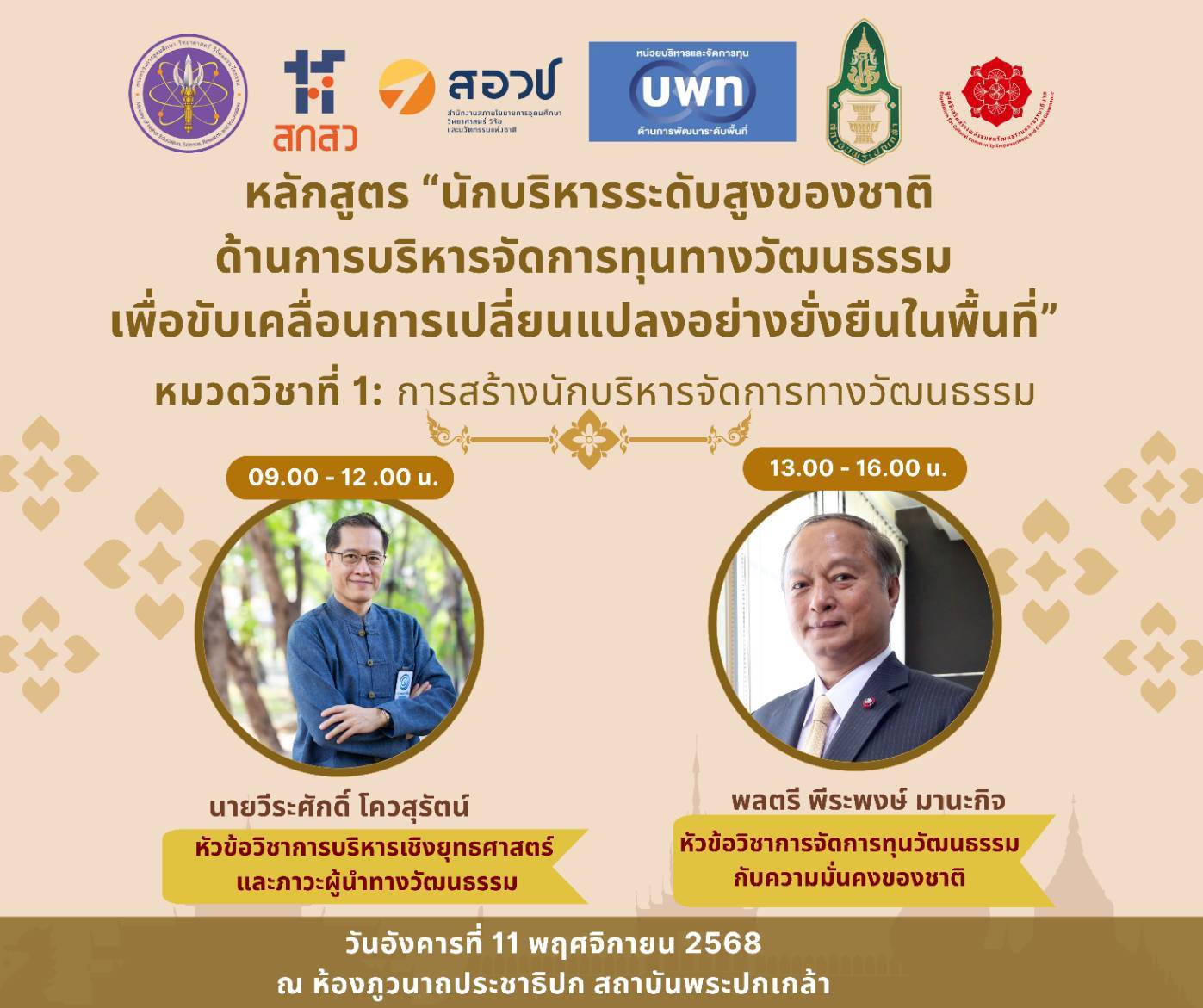 11 พย 2568 ไปบรรยายเรื่อง"การบริหารเชิงยุทธศาสตร์และภาวะผู้นำทางวัฒนธรรม" ในหลักสูตร ผู้บริหารระดับสูงของชาติ ด้านการบริหารจัดการทุนทางวัฒนธรรม เพื่อขับเคลื่อนการเปลี่ยนแปลงอย่างยั่งยืนในพื้นที่ ซึ่งเป็นหลักสูตรร่วมของ สถาบันพระปกเกล้า กับกระทรวง อว. สำนักงานสกสว. สำนักงานสอวช. และหน่วยบพท.