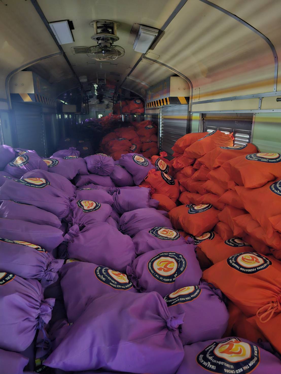 รถทหารจะจอดเทียบใกล้ชานชาลา กำลังพลขนถุงพระราชทานส้มม่วง 7,600 ถุง จะยกทีละถุงส่งต่อกันไปแบบมือต่อมือจนถึงตู้สินค้าของขบวนรถไฟ แล้วอีกทีมจะส่งขึ้น เพื่อทีมที่อยู่บนโบกี้รับต่อไปเป็นทอดจนกองครบเป็นกลุ่มๆ ที่พื้นโบกี้
