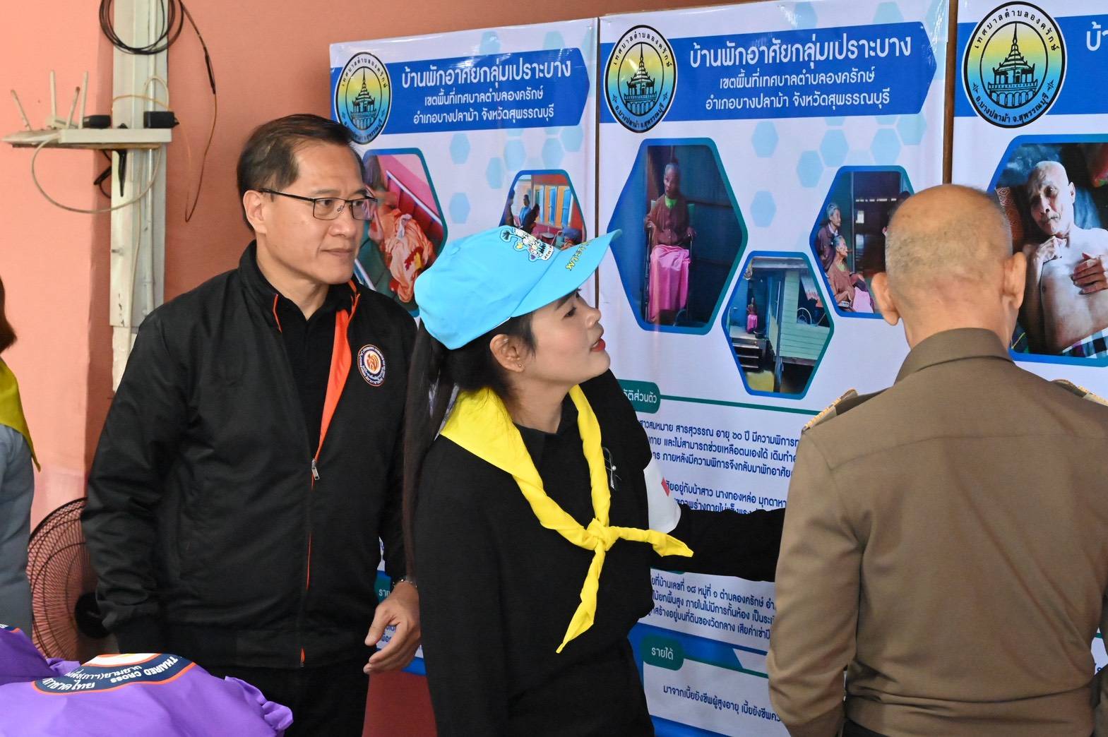 จากนั้นได้เดินทางไปยัง หมู่ที่ 1 ตำบลองครักษ์ อำเภอบางปลาม้า จังหวัดสุพรรณบุรี เยี่ยมให้กำลังใจกลุ่มเปราะบางและมอบถุงยังชีพพระราชทาน จำนวน 3 ราย