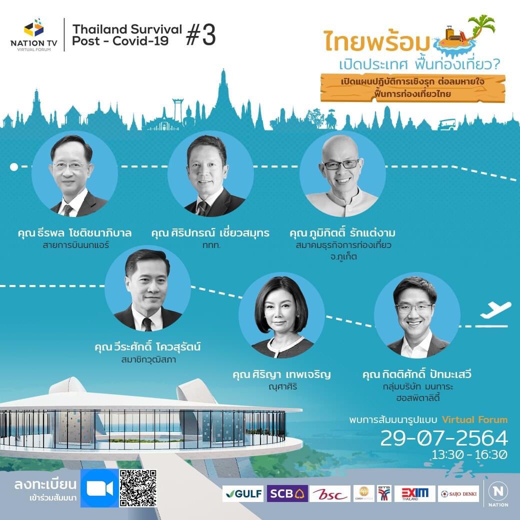 วันพฤหัสบดีที่ 29 กรกฎาคม2564 เวลา 13:30-16:30 น.ขอเชิญติดตามรับชม การเสวนาออนไลน์ Virtual Forum ‘’ภูเก็ตแซนด์บ๊อกซ์.. ท่ามกลางมรสุมโควิด’’ ฟัง วีระศักดิ์ โควสุรัตน์ สมาชิกวุฒิสภา อดีตรัฐมนตรีว่าการกระทรวงการท่องเที่ยวและกีฬา ธีรพล โชติธนาภิบาล จาก นกแอร์ ศิริปกรณ์ เชี่ยวสมุทร จาก การท่องเที่ยวแห่งประเทศไทย ภูมิกิตติ์ รักแต่งาม นายกสมาคมธุรกิจการท่องเที่ยว ภูเก็ต ศิริญา เทพเจริญ จาก ณุศาศิริ กิติศักดิ์ วัฒนะเสวี จาก กลุ่มบริษัท มนทาระ ฮอสพิทาลิตี้ แผนปฏิบัติการเชิงรุก ต่อลมหายใจ ฟื้นการท่องเที่ยวไทย